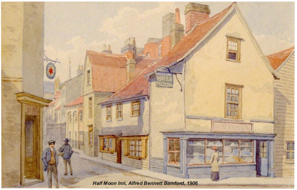 The public space that now occupies this area on the High Street is named Half Moon Square to commemorate the inn that once stood there.